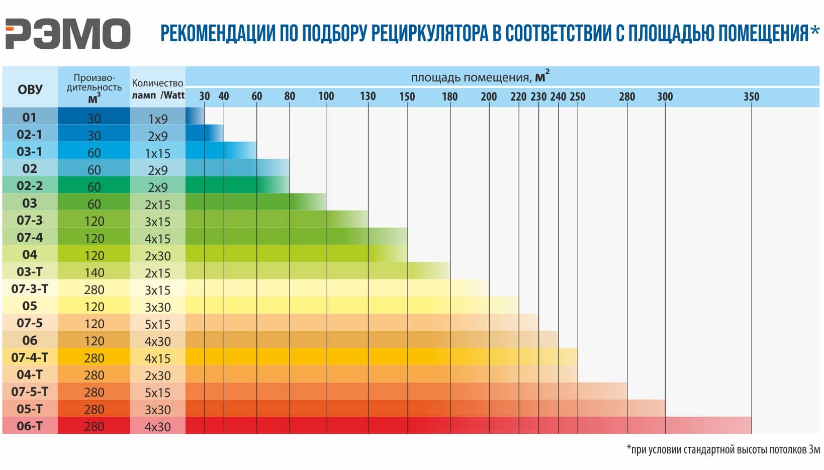 Каждый рециркулятор рассчитан на определённую площадь помещения: