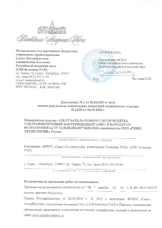 Наши рециркуляторы прошли проверки в НИИДез и в клинической больнице РАН. Это значит, что они соответствуют всем необходимым стандартам, нормам.